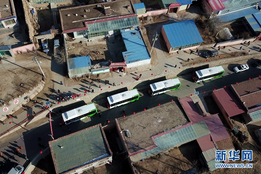 2018年1月16日,青海省首條交通扶貧公交專線在卡陽村開通運營,四輛嶄新的新能源公交車統一發車。新華網 潘彬彬攝