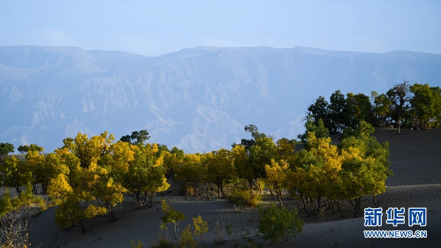 遠(yuǎn)處的胡楊在陽光的照射下呈現(xiàn)出多種色彩。新華網(wǎng) 潘彬彬 攝