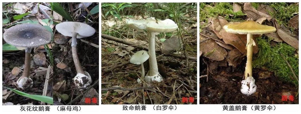圖為劇毒鵝膏菌中的部分成員 圖片來源:云南省衛生健康委員會、云南省疾病預防控制中心發布海報截圖拼接