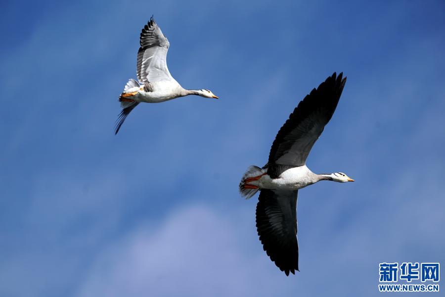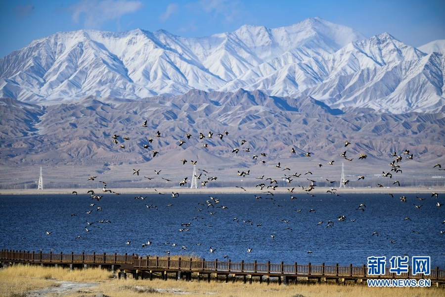天光云影,百鳥翔集,一群赤麻鴨在都蘭湖國家濕地公園上空飛翔。(11月21日攝)新華網 潘彬彬攝