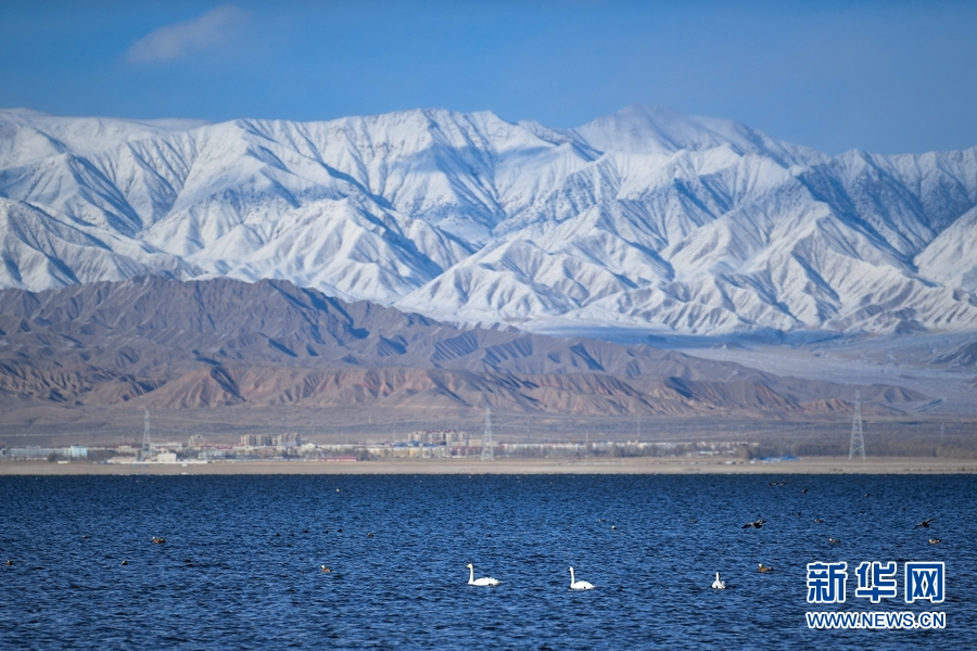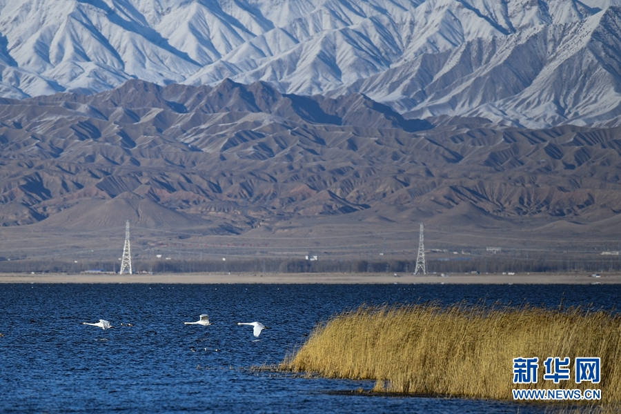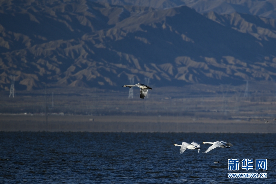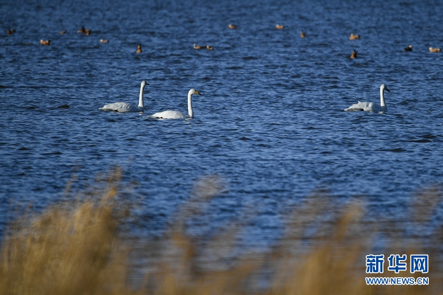 大天鵝、赤麻鴨在都蘭湖游弋。(11月21日攝)新華網 潘彬彬攝