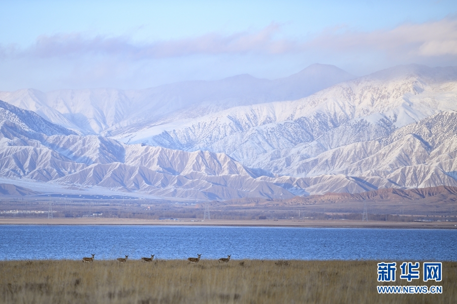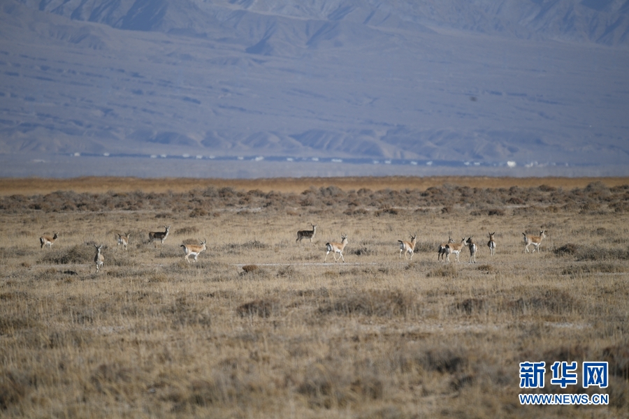 一群鵝喉羚在都蘭湖國家濕地公園內活動。(11月21日攝)新華網 潘彬彬攝