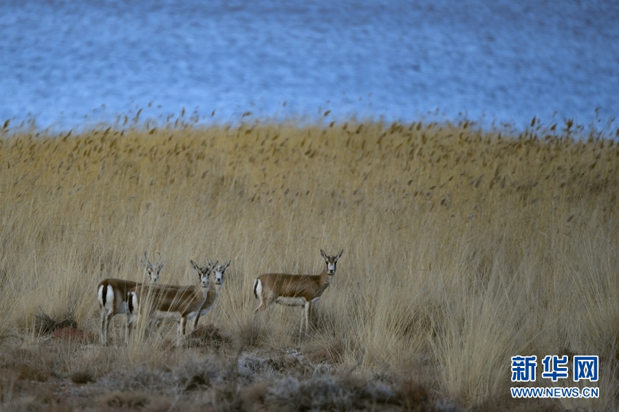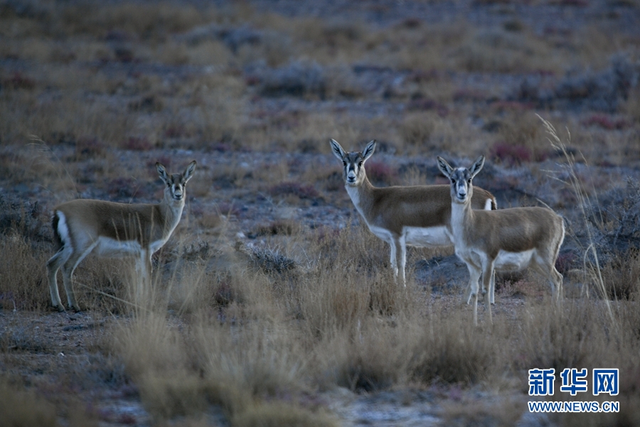 四只鵝喉羚在都蘭湖國家濕地公園內活動。(11月21日攝)新華網 潘彬彬攝