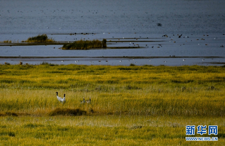 生活在都蘭湖國家濕地公園內的黑頸鶴一家。(9月24日攝)新華網 潘彬彬攝