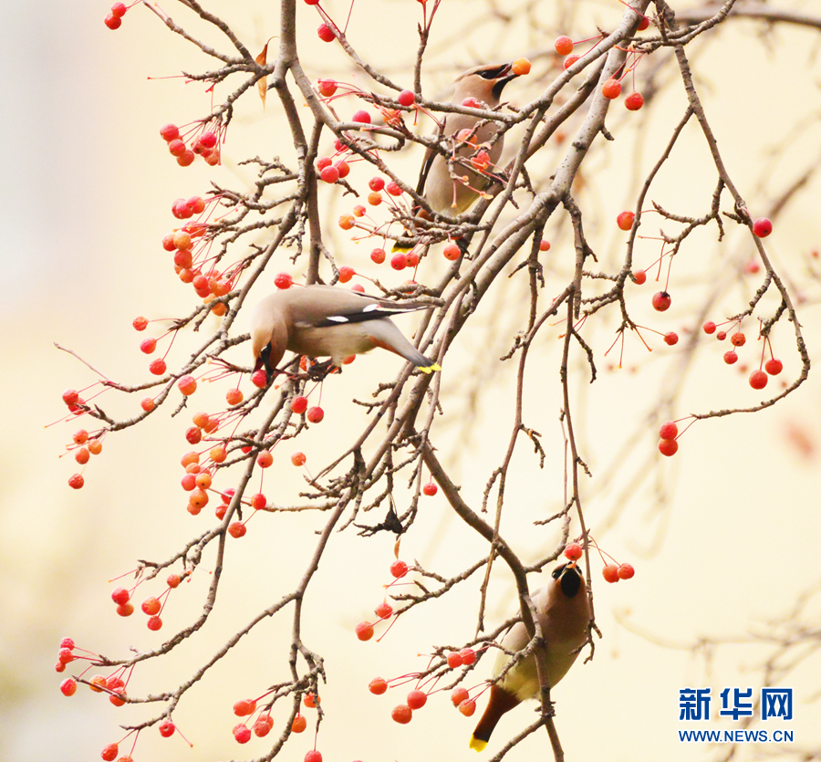 一群太平鳥正在“享用”海棠果。新華網發(李崇軒攝)