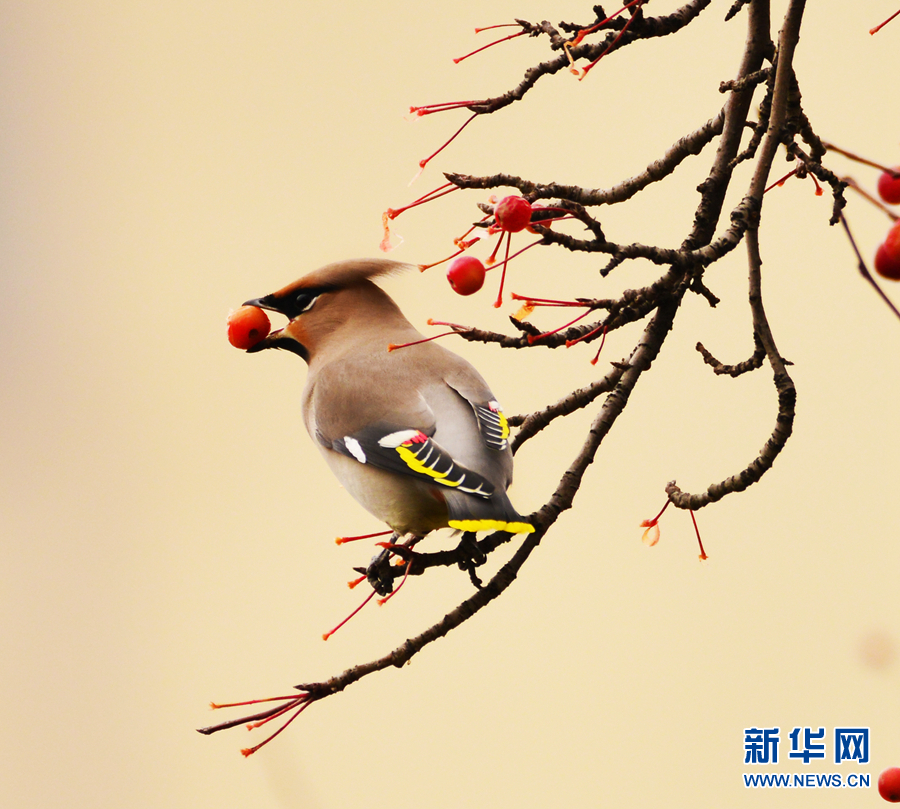 一只太平鳥正銜著一顆海棠果。新華網發(李崇軒攝)