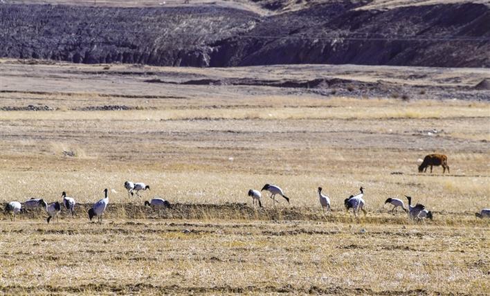 遠(yuǎn)遠(yuǎn)望去,只見(jiàn)高頸長(zhǎng)腿的黑頸鶴一邊覓食、一邊梳理羽毛,悠然自得。如果耐心一點(diǎn)在田間蹲守,不時(shí)還可以看到成群的黑頸鶴飛翔于冬日的藍(lán)天下,姿態(tài)優(yōu)美地盤旋,尋找合適的田間落下。旦增說(shuō),它們要覓食至傍晚時(shí)分,才成群結(jié)隊(duì)飛回虎頭山水庫(kù)。