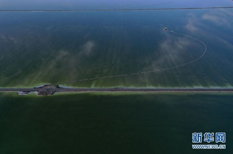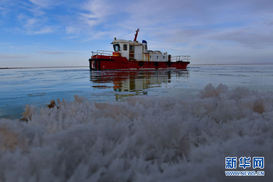 一艘工作船行駛在察爾汗鹽湖內(11月27日攝)。新華社記者 張龍 攝