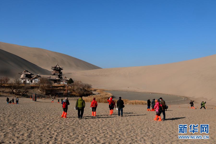 12月1日,游客在甘肅省敦煌市鳴沙山月牙泉景區(qū)游覽。新華社發(fā)(張曉亮 攝)