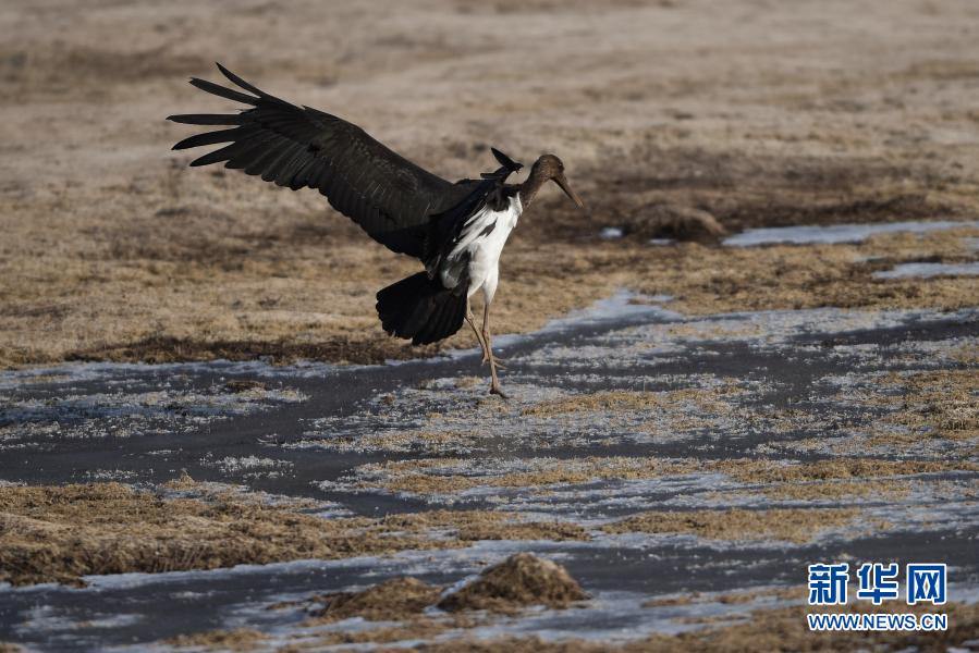 12月6日,一只黑鸛在西寧市北川河濕地公園內(nèi)嬉戲。新華社記者 吳剛 攝