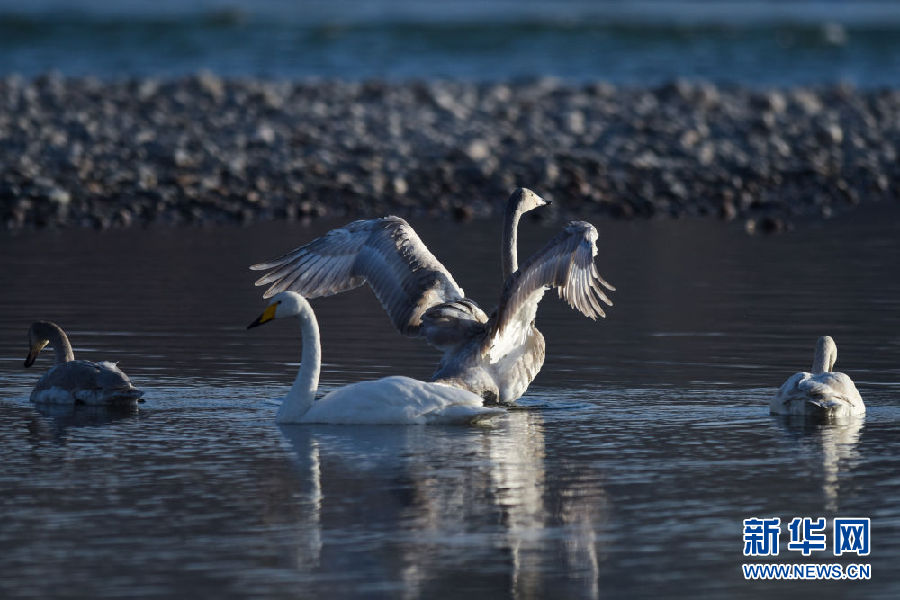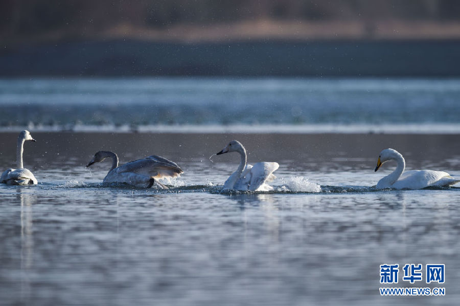 12月11日,幾只大天鵝在青海省貴德縣境內的黃河里嬉戲。新華社記者 吳剛 攝