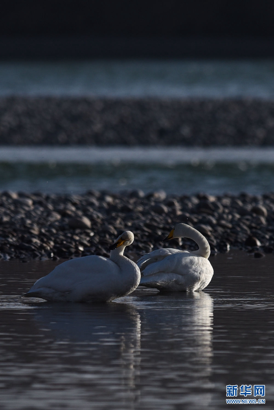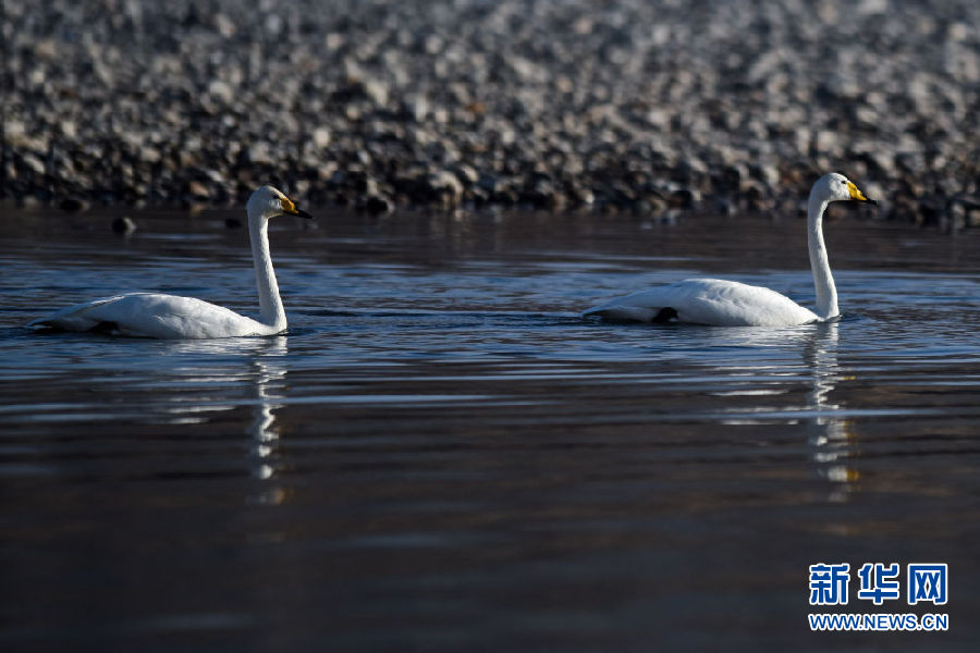 12月11日,兩只大天鵝在青海省貴德縣境內的黃河里游弋。新華社記者 吳剛 攝