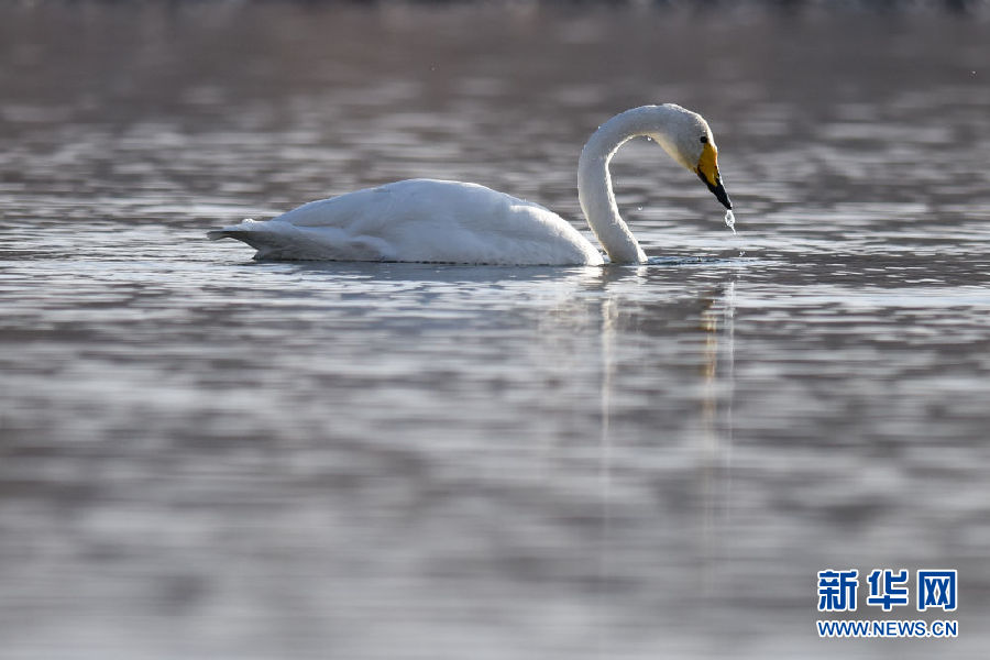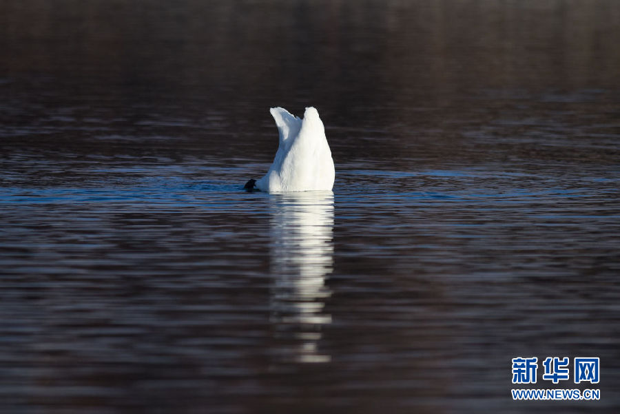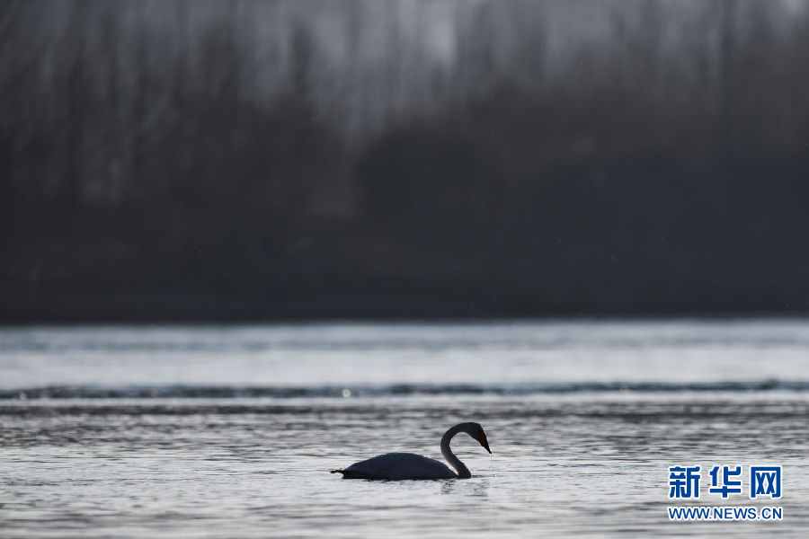 12月11日,一只大天鵝在青海省貴德縣境內的黃河里覓食。新華社記者 吳剛 攝