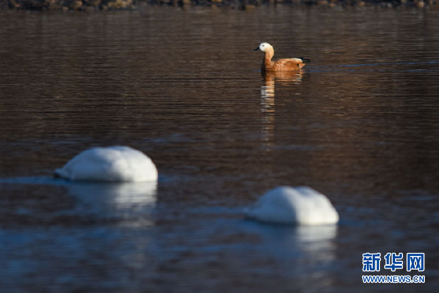 12月11日,一只赤麻鴨與大天鵝在青海省貴德縣境內的黃河里游弋。新華社記者 吳剛 攝